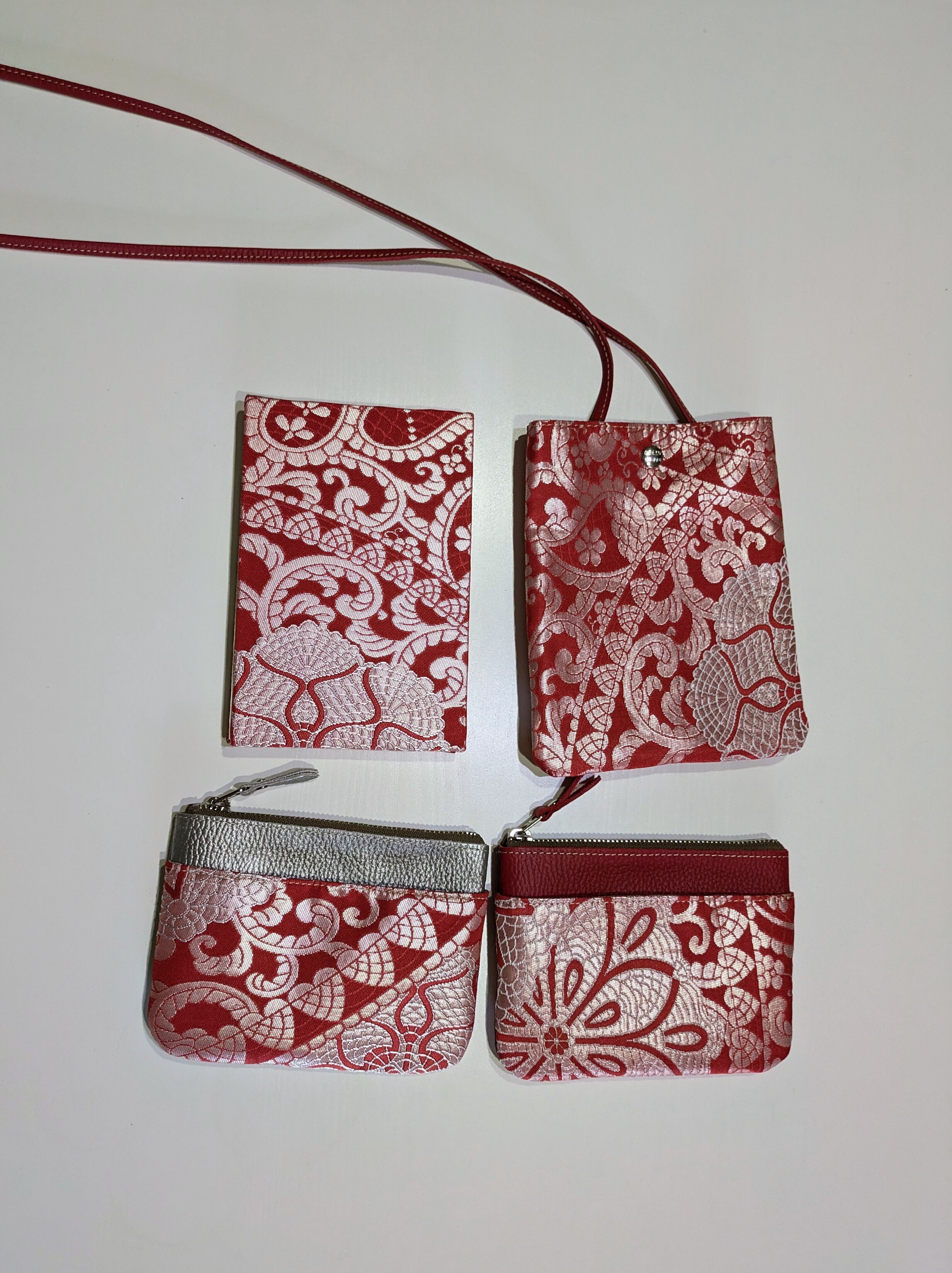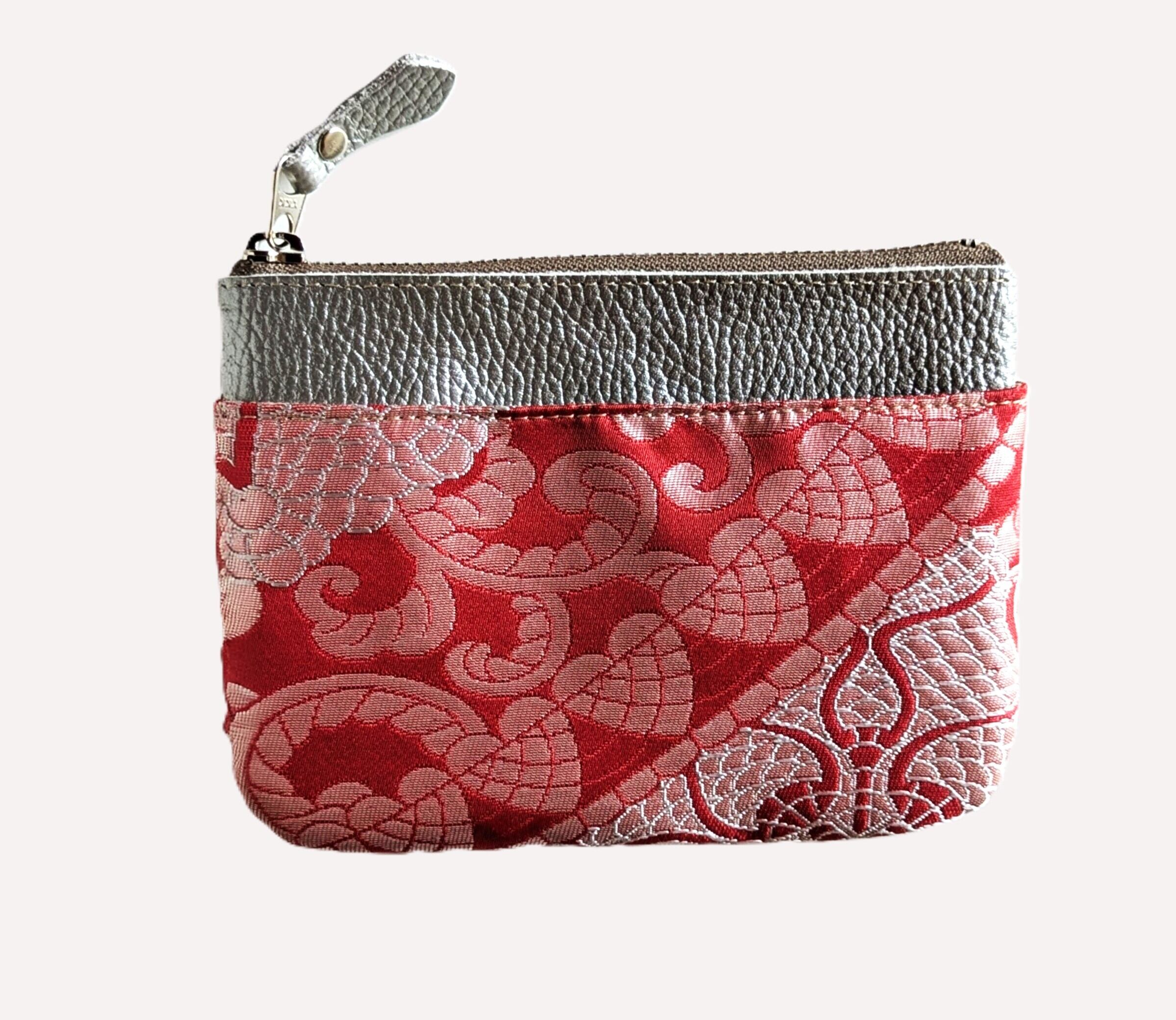 西陣織ポーチ【レース華文】赤 × 【グローブレザー】シルバー